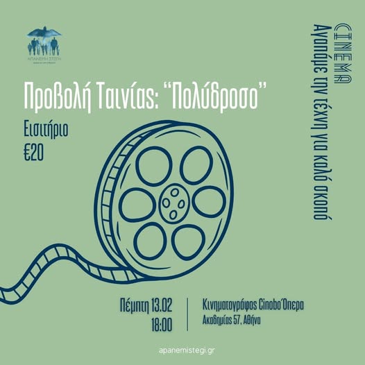 Η Εθελοντική Ομάδα Δράσης «Έλα κι εσυ!» στέκεται στο πλευρό της ΑΠΑΝΕΜΗΣ ΣΤΕΓΗΣ και στηρίζει την πρωτοβουλία της για την προβολή της ταινίας του Αλέξανδρου Βούλγαρη «Πολύδροσο» (The Boy), την Πέμπτη 13 Φεβρουαρίου στις 6.00 μ.μ. στον κινηματογράφο Cinobo Opera (Ακαδημίας 57, Αθήνα). Τα έσοδα από την εκδήλωση θα διατεθούν για τη στήριξη και φροντίδα κακοποιημένων παιδιών. Η ταινία «Πολύδροσο» είναι μια ιστορία που θα σας αγγίξει βαθιά: ένας ύμνος στην τρυφερότητα, ακόμα και όταν ο κόσμος γύρω μας δεν είναι τρυφερός. Μετά την προβολή θα υπάρχει η δυνατότητα συνομιλίας με τον σκηνοθέτη, τη Σοφία Κόκκαλη και τη Βίκυ Καγιά.